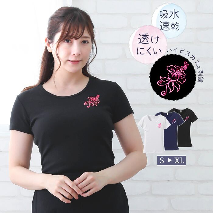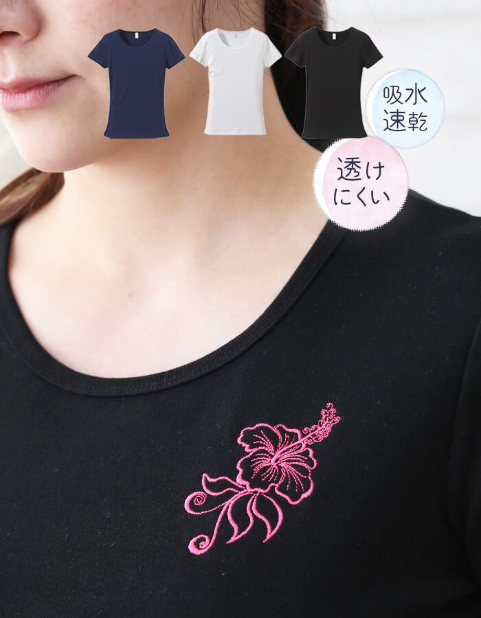 繊細な ハイビスカス 刺繍入り 6.2オンス CVC フライス Tシャツ